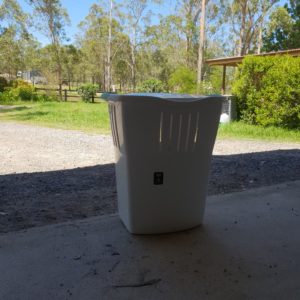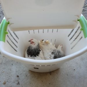 A customer came yesterday with a most innovative way to transport her light sussex home….a laundry basket. Easy to clean, good ventilation and lots of room to stretch your neck.